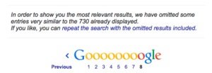 Si vous avez une bonne connaissance du contenu dupliqué, vous serez en mesure de le trouver en effectuant des contrôles manuels sur un site, mais pour une vérification rapide, vous pouvez effectuer une recherche de site dans Google (site:votredomaine.com). Si vous voyez le message suivant sur la dernière page des résultats de recherche, il est possible que le contenu soit dupliqué. Vous devrez approfondir votre recherche pour en être certain.